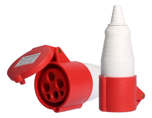 A tomada possui uma corrente nominal de 16A e uma voltagem nominal de 380/415 V . Além disso, a tomada é feita de poliamida autoextinguível com terminais de latão sólido, garantindo durabilidade e resistência.
