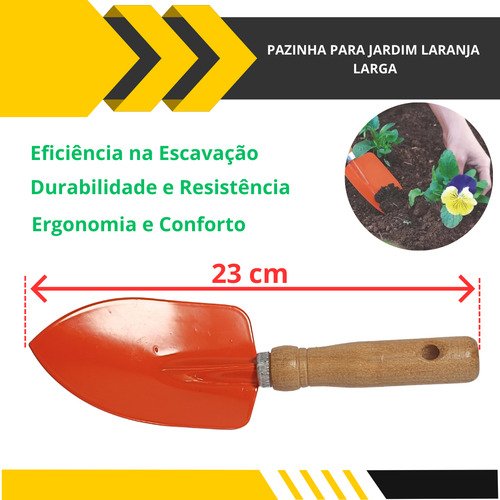 Versatilidade de Uso:A pazinha larga é versátil e pode ser utilizada para diversas tarefas, como cavar buracos para o plantio, movimentar terra, nivelar o solo e realizar outras atividades relacionadas à jardinagem.